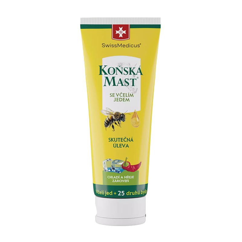 Konská masť so včelím jedom je unikátny produkt, ktorý spája osvedčený účinok 25 druhov bylín s účinkom včelieho jedu. Včelí jed slúži ako prírodná látka na zníženie citlivosti. Táto receptúra zároveň obsahuje zvýšený podiel bylín, o ktorých je známe, že zlepšujú pružnosť a hybnosť. Konská masť so včelím jedom je vhodná na masáž pokožky v oblasti natiahnutých svalov, chrbta a kĺbov. Vďaka použitiu špeciálnej zmesi ingrediencií môže tento balzam chladiť aj hriať zároveň. Tento efekt môže na začiatku aplikácie spôsobiť mierne ochladenie, následne však dochádza k prehriatiu a žiaducemu prekrveniu pokožky.